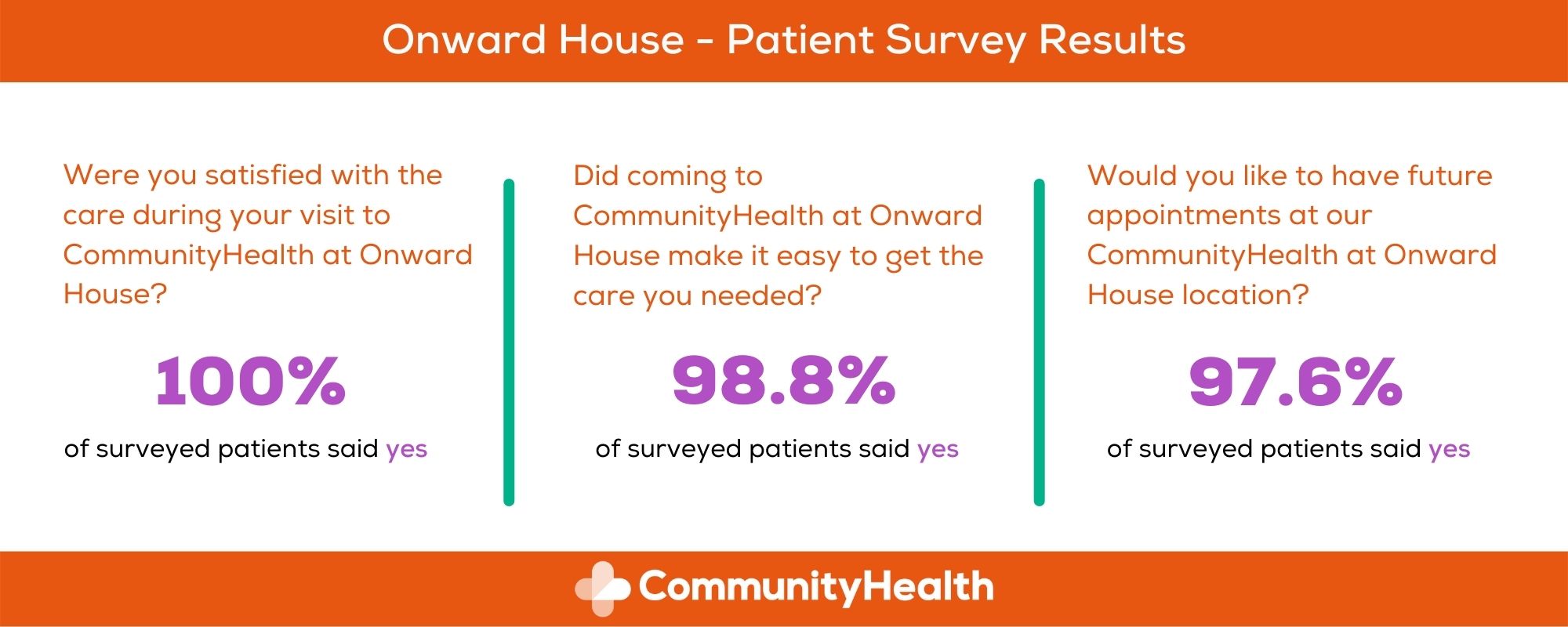 Of course, the true measure of success depends on the patient experience. We surveyed 84 of the patients who visited CommunityHealth at Onward House so far, and the results are overwhelmingly positive: