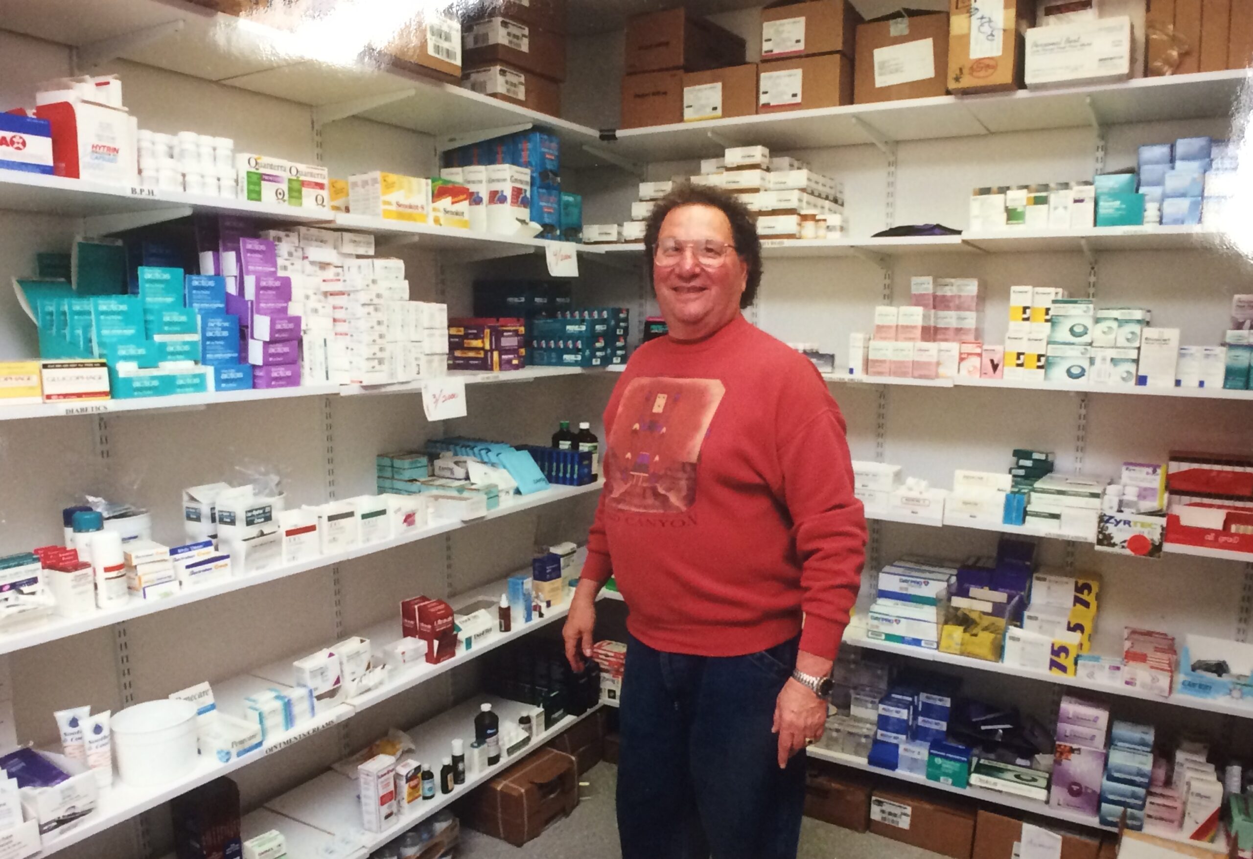 Milt in the CommunityHealth dispensary circa the 00s, surrounded by medications he helped source.